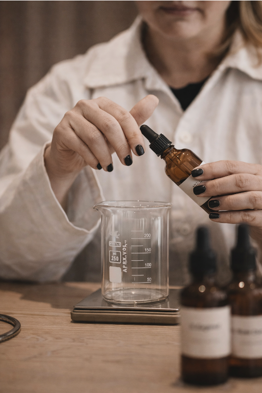 Utifrån brief skapar vi doften i vårt hantverkslabb. Ni är välkomna att delta i processen, dofta och finjustera.